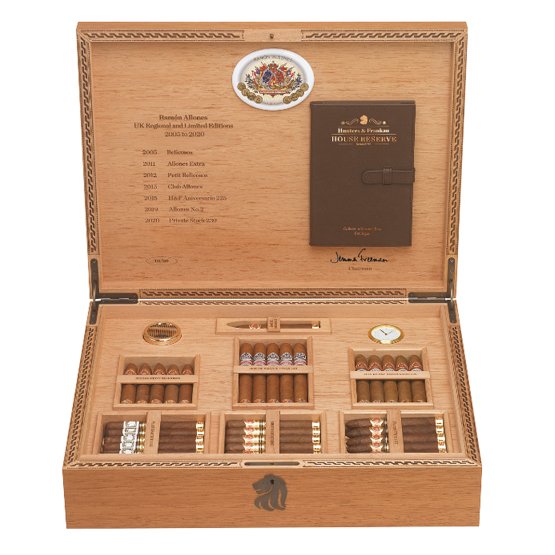Just fifty numbered pieces have been commissioned from Italian humidor makers, DeART S.r.l. Each one contains sixty-one Ramón Allones cigars, made in Havana under the authority of Habanos S.A. and every Ramón Allones Limited Edition and UK Regional Edition is included. This provides seven different cigars spanning a period of sixteen years. They are classified as special productions either due to the ageing of the tobacco used in their manufacturing or because they have been produced exclusively for the UK market. For the first time, we are presenting the as yet unreleased Ramón Allones Private Stock 230, a cigar created to commemorate Hunters & Frankau’s 230th Anniversary in 2020. We hope you enjoy this special collection of cigars.