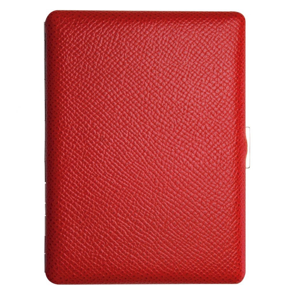This elegant cigarette case from Tsubota Pearl can hold 9 superking cigarettes, or 12 regular cigarettes. These fine cigarette cases are made in Japan using Noblesse calf leather and brass.