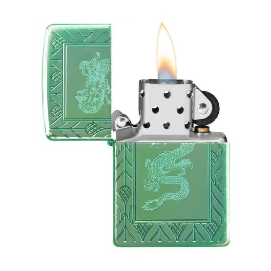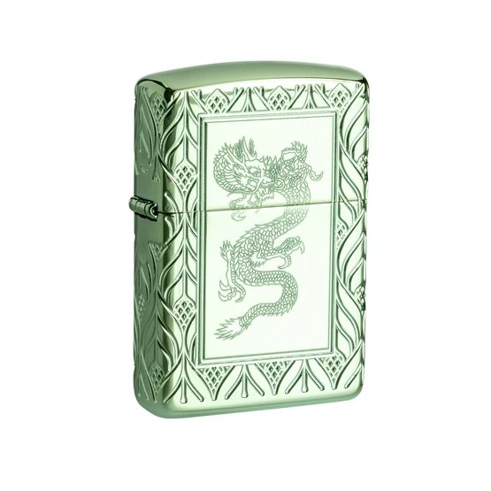 The Zippo Armor® High Polish Green Elegant Dragon Lighter is a striking fusion of robust design and intricate artistry. Crafted with the Armor® case, it boasts a thicker and more durable construction compared to standard Zippo lighters. The high polish green finish provides a vibrant backdrop for the detailed Art Deco pattern, achieved through Zippo’s MultiCut process, which envelops the lighter’s surface. Prominently featured on the front is a lustre-etched dragon, symbolizing power and elegance, adding a touch of mystique to the design. As with all Zippo lighters, it delivers a reliable, windproof flame, ensuring functionality in various conditions. This refillable lighter is designed for a lifetime of use, with optimal performance achieved using Zippo premium lighter fluid, flints, and wicks. Each piece comes packaged in a gift box, making it an excellent choice for collectors and enthusiasts alike.